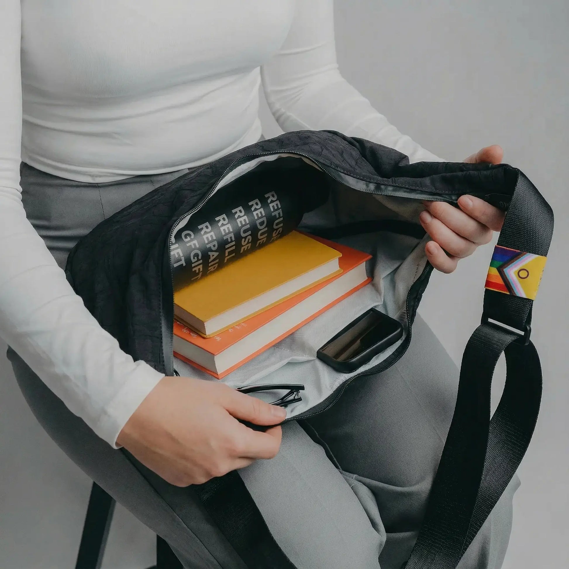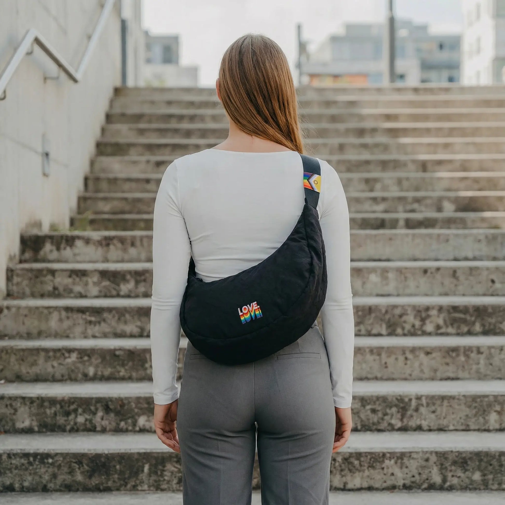 Die 9L Halbmondtasche aus Airbags · Im Design der limitierten Pride-Edition