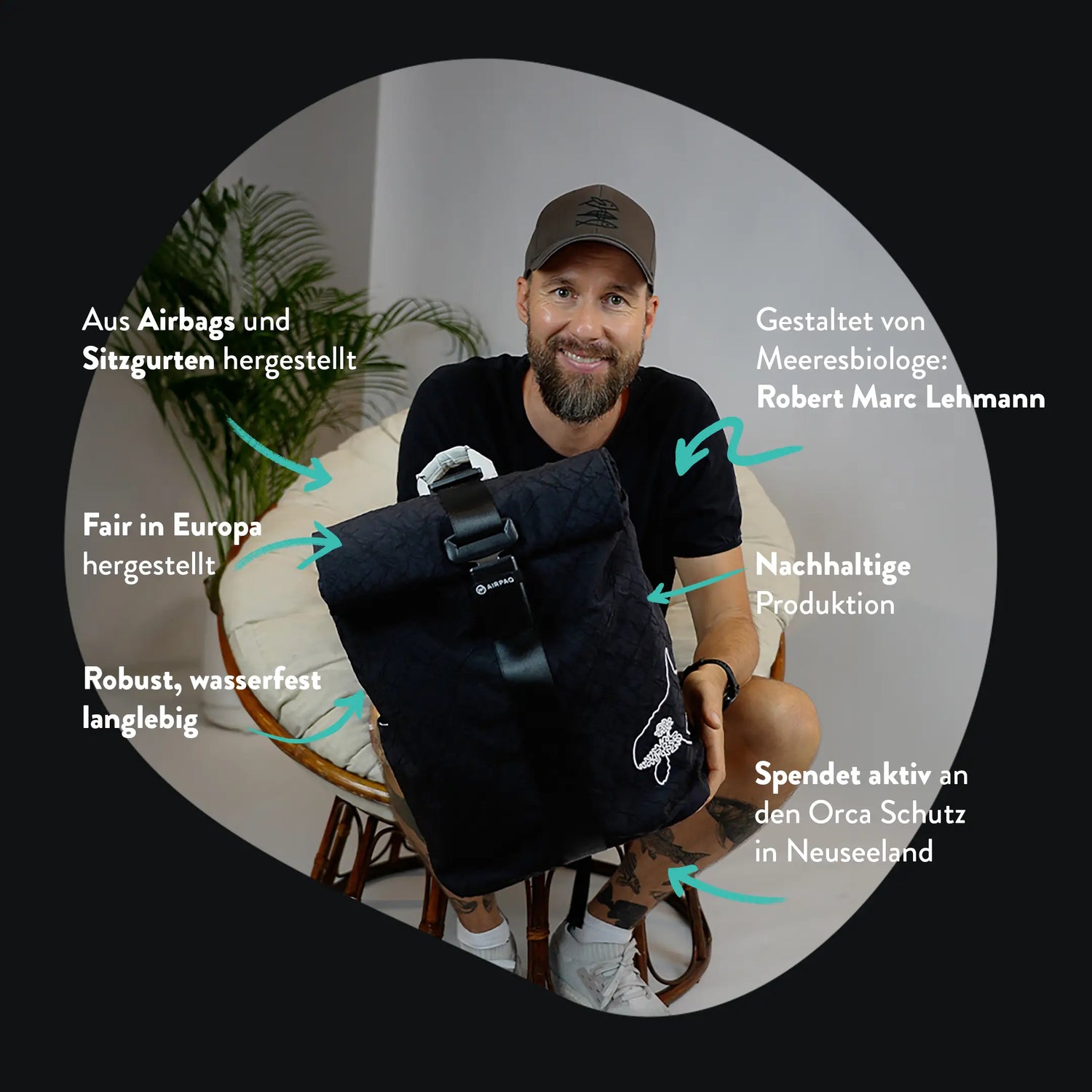 Die Orca-Sonderedition vereint Nachhaltigkeit, Qualität und Impact:Aus Airbags & Sitzgurten: Hochwertig upgecycelt für Langlebigkeit.Nachhaltig & fair: Produziert in Europa unter fairen Bedingungen.Von Experten gestaltet: Entwickelt mit Meeresbiologe Robert Marc Lehmann.Ein Zeichen für Tierschutz: Jeder Kauf unterstützt den Schutz der Orcas in Neuseeland.