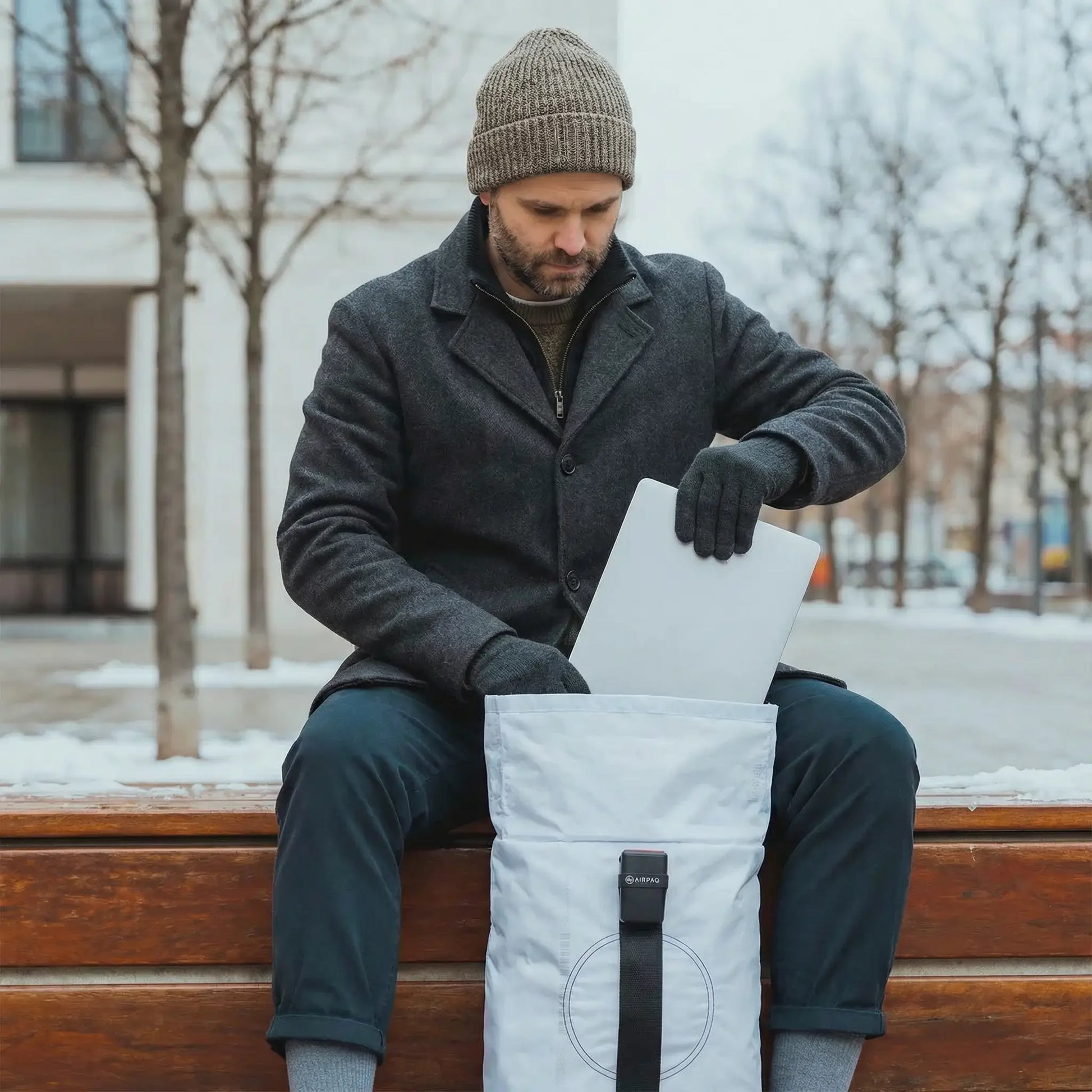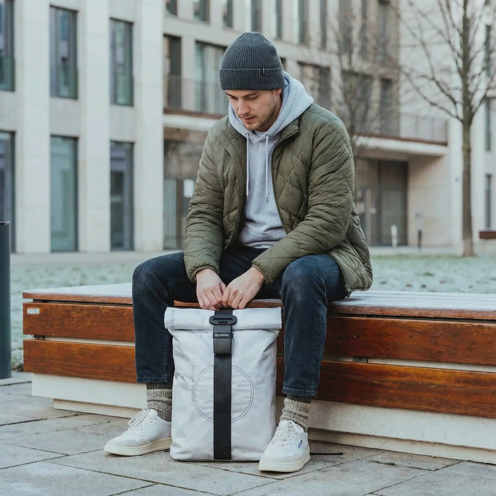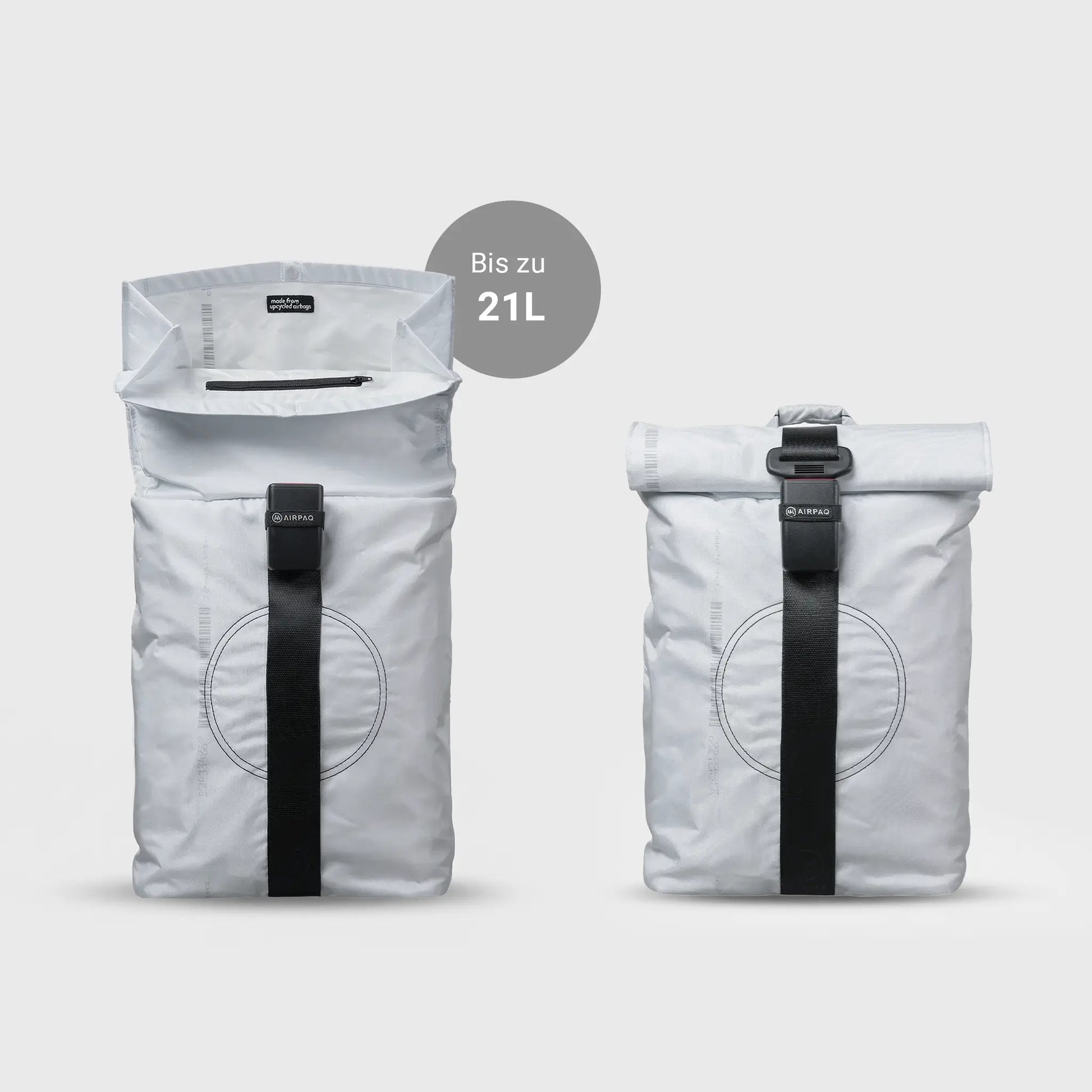 Der Rucksack aus ungefärbten Airbags · 21 L Volumen · Für Alltag, Beruf und Freizeit gemacht.