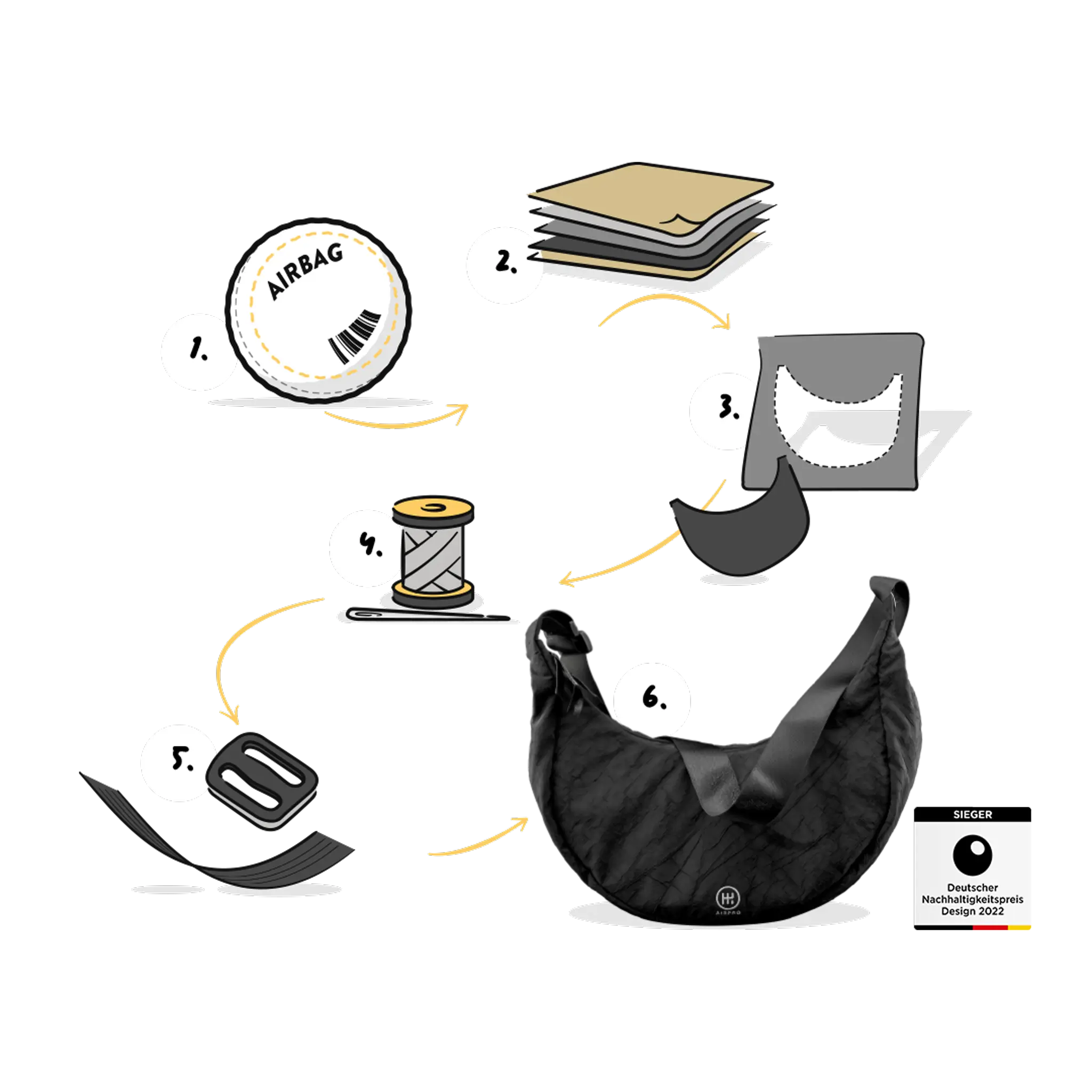 Wir beziehen überschüssige Materialien wie Airbags und Autogurte direkt aus der Sicherheitsindustrie, bevor sie recycelt oder verbrannt würden. Statt diese Materialien energieintensiv aufzubereiten, verwenden wir sie in ihrer bestehenden Form weiter. Das ist die Königsklasse der Nachhaltigkeit, denn Upcycling schont Ressourcen oft noch effektiver als Recycling