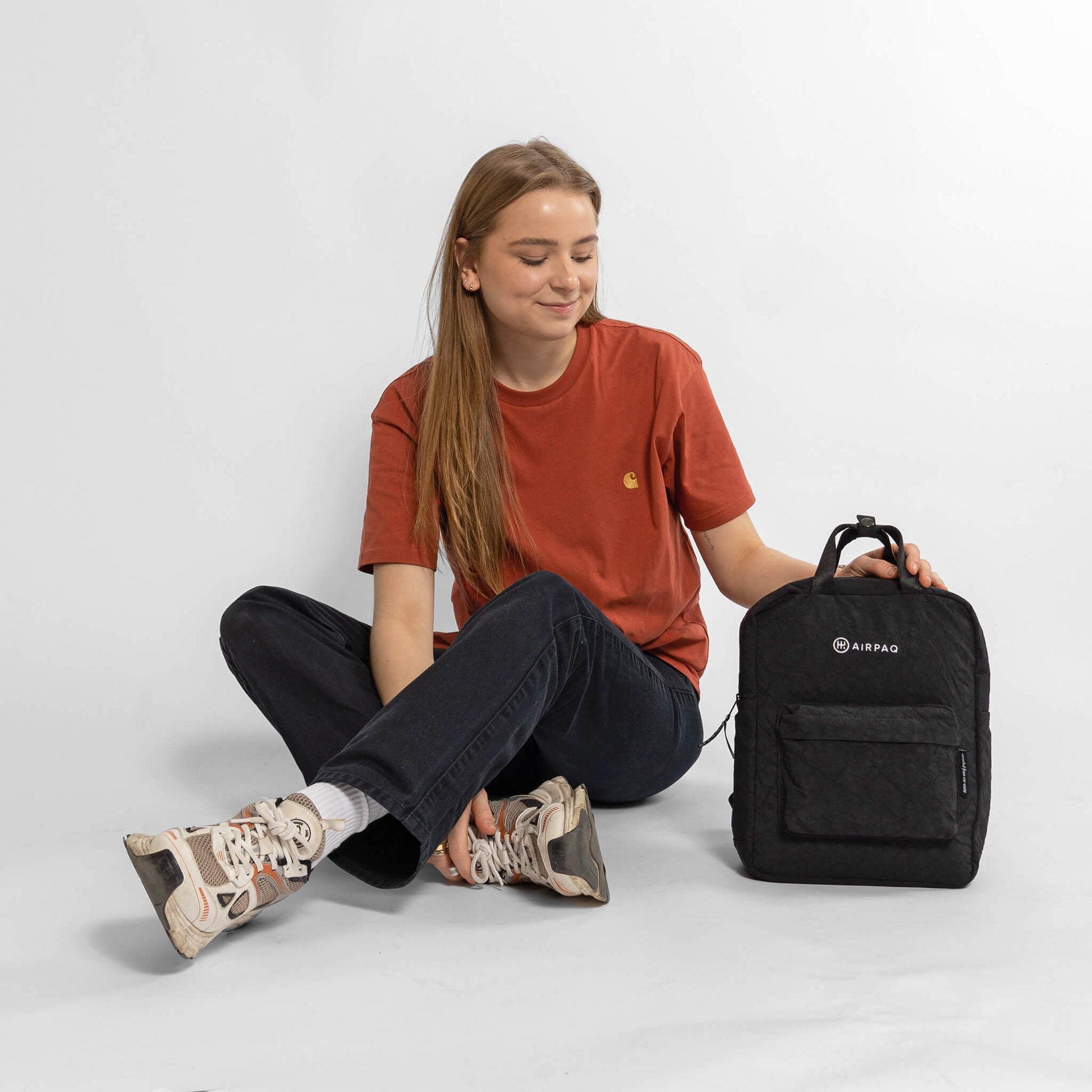 Mit gepolsterten Trägern aus Sicherheitsgurten und cleveren Fächern bietet der Airpaq-Rucksack maximalen Tragekomfort und eine durchdachte Organisation. Ob du zur Arbeit pendelst oder auf Reisen bist – du bist bestens ausgestattet und hast alles griffbereit.